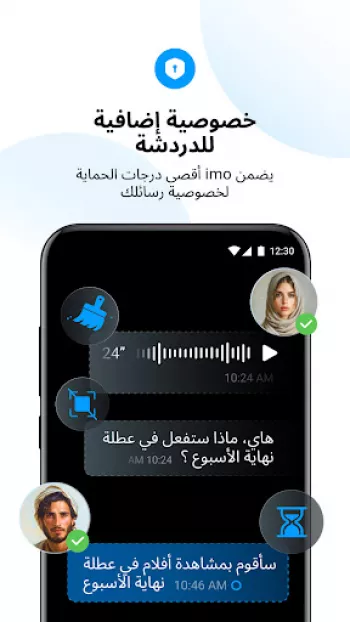 يعمل imo على ضمان أقصى قدر من الحماية لخصوصية رسائلك، حيث يستخدم خصائص حماية مثل الآلة الزمنية ورسالة الاختفاء والدردشة الخاصة وحماية الشاشة والتشفير التام بين الطرفين لتعزيز مستوى خصوصية دردشاتك. يمكنك حذف أي رسائل دردشة وتعيين موقتات الرسائل وحظر لقطات الشاشة والنسخ والمشاركة والتنزيل لمحتوى الدردشات الخاصة، مما يتيح حماية الخصوصية بصورة مشابهة لتطبيقات WhatsApp و Telegram.