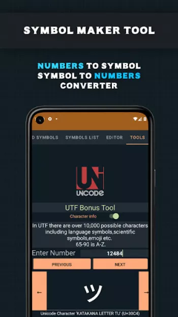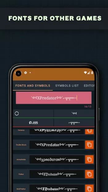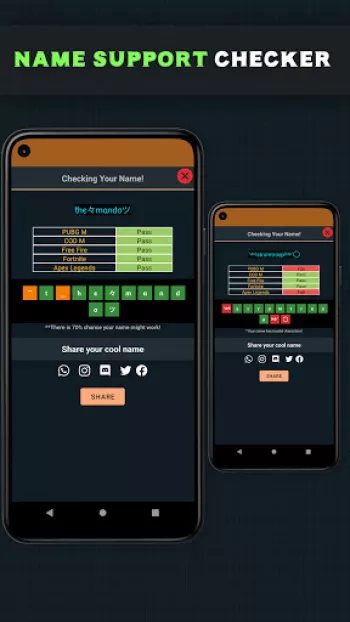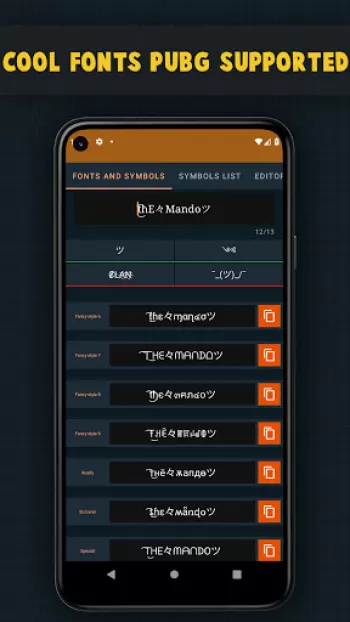 Effortlessly Craft Distinctive In-Game Usernames with Symbols for PUBG, Free Fire, CODM, and Beyond! 😎   Experience the World's First Nickname Generator for PUBG with an Integrated Name Compatibility Checker! 📱✅ What does that mean? -  With Name Creator for PUBG, you can seamlessly verify the compatibility of your customized username with your favorite game, all within this app! - Simply tap the copy icon to perform a compatibility test—PASS ✅ or FAIL ❌—with your selected game. - For instance, if your chosen name is compatible with PUBG, it will proudly display a ✅ result as you copy it from the list.   Name Creator for PUBG boasts a rich library of over 25 Text Styles and 200+ Symbols, including 15+ meticulously tailored for PUBG. 🎆   🎉Craft usernames like these and more🎉 - Ⓕⓐⓝⓒⓨ Ⓖⓐⓜⓔⓡ , - 千卂几匚ㄚ Ꮆ卂爪乇尺 - ꄘꋫꁹꏸꐟ ꁍꋫꁒꍟ꒓ - Ḟäńċÿ Ġäṃệŕ - ɟɐnɔʎ ƃɐɯǝɹ 🕹Generate Unique Nicknames for PUBG Mobile, Call of Duty Mobile, Free Fire, Fortnite, and Apex Legends!🕹   Unlock the bonus tool 🔧 within Name Creator for PUBG to craft symbols or characters by simply inputting numeric values! Identify the characters your friends use with ease by copying and pasting them into our UTF tool! For example, the character ツ is KATAKANA LETTER TU If you're aware of intriguing symbols, feel free to share them with us 📩, and we'll consider incorporating them in our future releases! If you encounter any issues, incorrect filters, or unsupported names, please report them in the Name Creator for PUBG feedback section or via email.   Help us spread the word about Name Creator for PUBG among your friends and family. When one family member purchases it, others can enjoy it for free!* *Disclaimer: "Name Creator for PUBG" and our studio are not affiliated with or endorsed by PUBG. PLAYERUNKNOWN'S BATTLEGROUND COPYRIGHT ©2017 BLUEHOLE INC. ALL RIGHTS RESERVED. PLAYERUNKNOWN'S BATTLEGROUNDS is a registered trademark of Bluehole, Inc. and its affiliates.