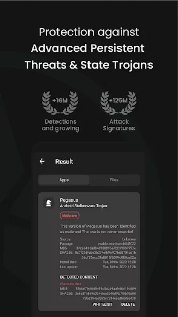 تم تصميم برنامجنا للمستخدمين الذين يقدرون الأمان المتقدم. ولهذا، فإن ماسح الفيروسات لدينا معتمد من قبل مؤسسات مستقلة رائدة مثل AV-TEST وTesting Ground Labs في 2023 و2024. مع معدل اكتشاف استثنائي يبلغ 99.96%، يتفوق برنامجنا على حتى أشهر تطبيقات مكافحة الفيروسات للأجهزة المحمولة.