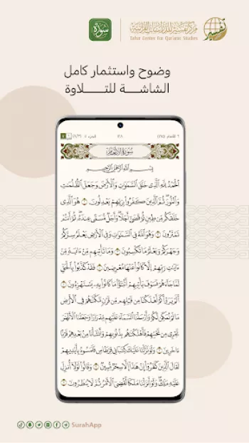 يُعتبر تطبيق "تلاوة السور" إحدى المبادرات الرائدة من مركز تفسير للدراسات القرآنية، حيث يقدم نسخة رقمية من المصحف الشريف مزودة بواجهات متعددة وخصائص عالية الجودة. هذا التطبيق يهدف إلى تقديم تجربة استثنائية لمستخدميه، تجمع بين سهولة الاستخدام وتقديم خدمات علمية نوعية موثوقة بإشراف فريق مركز تفسير للدراسات القرآنية. ومن هنا يبدأ التطبيق بتوضيح ما يقدم من ميزات متعددة، بدءًا من اختيار الكلمة، الآية، الصفحة والسورة، مما يفتح للمستخدمين باب الوصول إلى معلومات موثوقة ومحدثة حول كل منها. فعندما تقرأ صفحة من المصحف عبر التطبيق، ستظهر لك بوضوح وبدقة عالية، كما أن التصميم يجعل القراءة مريحة للعين من خلال استثمار الشاشة بالكامل لإظهار النص بشكل واضح. يتضمن التطبيق أيضًا محتوى علمي محقق، يهدف إلى مساعدة المستخدمين في فهم معاني القرآن الكريم من خلال مجموعة خدمات مصممة بعناية. تتضمن هذه الخدمات توضيح المصطلحات القرآنية الغريبة، تفسير (تفسير) الآيات، أسباب النزول والظروف المحيطة بها، فضائل السور والآيات، وعدد الآيات في كل سورة، كما يوفر ترجمات للعديد من اللغات. كل هذه الميزات تسهم في جعل التطبيق مرجعاً رقمياً متكاملاً للقرآن الكريم، حيث يستطيع المستخدمون التنقل بسهولة بين خدماته المتعددة والوصول إلى المحتوى العلمي الموثوق.