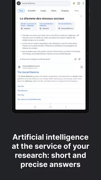 الذكاء الاصطناعي يُعد مكونًا رئيسيًا في تحسين وتطوير خدمات البحث على الإنترنت، و"Qwant" لا يشذ عن هذه القاعدة، حيث يدير تجربة فريدة تلبي احتياجات المستخدم اليومية عبر تحسين جودة النتائج المستخرجة. هذا التطبيق المتميز يدمج الذكاء الاصطناعي لدعم المستخدمين في حياتهم اليومية عبر تقديم إجابات سريعة ودقيقة على تساؤلاتهم المتنوعة، سواء كانت متعلقة بالأخبار أو الثقافة أو الرياضة أو المعلومات الإدارية. هذا الخدمة غير مدفوعة، مما يعني أن المستخدمين لا يحتاجون إلى القلق بشأن التكاليف الخفية أو الاشتراكات غير المرغوب فيها. إن تقنية الذكاء الاصطناعي في "Qwant" تسهم في تقديم نتائج متقدمة تتوافق بشكل كبير مع الكلمات المفتاحية المستخدمة دون تعقب للبحث التاريخي للمستخدم بهدف تحسين جودة وتجربة المستخدم دون الحاجة لتجميع بياناتهم الخاصة.