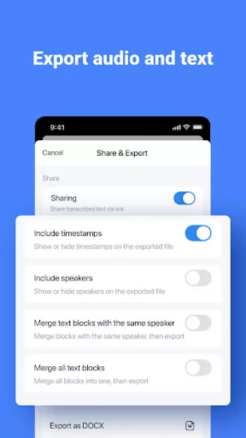 تطبيق رائع يعطي تفريغ للنص كاملاً ولا توجد اعلانات مزعجة حتى الآن. يقوم بتحويل النص بشكل ممتاز باللغة الانجليزية
