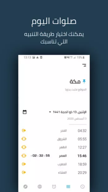 جيد ومفيد وفيه خاصية وضع الصامت اثناء الصلاه ويفتح تلقائي بعد انتهاء الصلاة طبعا يجب الدخول على الاعدادات يعني ما يحتاج تحطه صامت وقت الصلاه ولا خر...