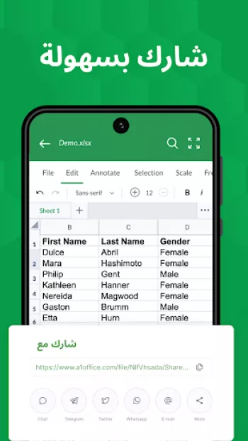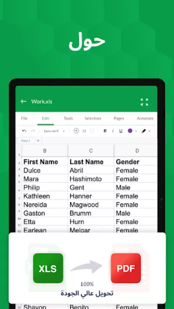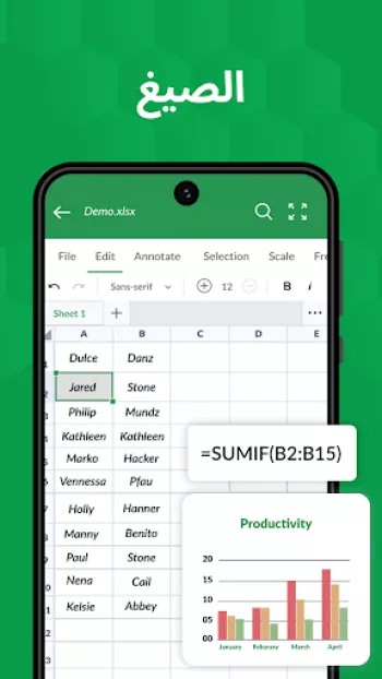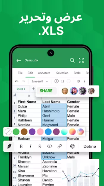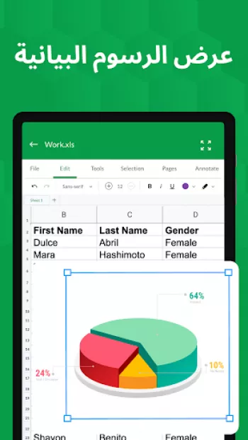 برنامج عارض ومحرر جداول Excel هو أداة متعددة الاستخدامات تتيح للمستخدمين فتح وقراءة وتحرير ملفات Excel بسهولة ومرونة. يتيح البرنامج للمستخدمين فتح أنواع متعددة من الملفات مثل XLS، CSV، XLSX، XLSM مباشرة من مدير الملفات أو البريد الإلكتروني أو عبر الويب دون الحاجة لفتح التطبيق. ويُعتبر هذا البرنامج الأكثر فعالية في زيادة الإنتاجية المكتبية حيث يمكنه قراءة وتحرير جداول XLSX وجعلها سهلة الاستخدام والفهم. تعتمد ميزات التطبيق وخيارات التنسيق على تبسيط البيانات وتقديمها بطرق سهلة الفهم، بحيث يمكن للمستخدمين إنشاء وطباعة الرسوم البيانية وتحليل البيانات بسهولة. يتميز التطبيق بدعمه لجميع الأجهزة، مما يجعله أداة مفيدة للمستخدمين الذين يسافرون أو يحتاجون للوصول إلى بياناتهم أثناء التنقل. يتيح التطبيق أيضًا للمستخدمين مراجعة ملفات XLX وإنشاء نسخ مكررة من الجداول أو إخفاء وإظهار الأوراق بوضوح وكفاءة.