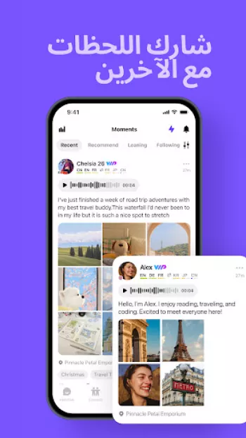 خاصية Moments في HelloTalk توفر منصة اجتماعية حيوية للمستخدمين لمشاركة أفكارهم وثقافاتهم وتبادل التجارب الحياتية مع متعلمين آخرين من كل أنحاء العالم. يمكن للمستخدمين نشر تحديثاتهم اليومية، صورهم، أو أفكارهم، مما يعزز من فرص التفاعل والتواصل مع الآخرين الذين يشاركونهم نفس الاهتمامات اللغوية والثقافية. هذه الخاصية تشجع على استكشاف الثقافات الأخرى وتقديم نظرة أعمق على حياة الناس في الثقافات المختلفة، ومن ثم تشكل فرصة رائعة لتوسيع الأفق الثقافي والاجتماعي. يتيح Moments للمتعلمين تجربة كيفية استخدام اللغة في الحياة اليومية، مما يمنحهم فهمًا أعمق للغة من خلال السياقات الاجتماعية المختلفة. إضافة إلى ذلك، يعزز Moments من الفهم العاطفي بين المستخدمين ويشجعهم على استكشاف التنوع الثقافي بعيون متجددة وانفتاح فكري.