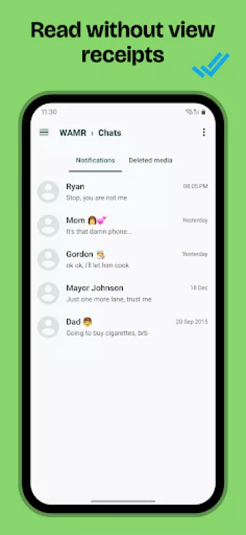 في الوقت الذي أصبحت فيه الخصوصية موضوعًا رئيسيًا في العصر الرقمي الحالي، يبرز WAMR كإضافة قوية لأي مستخدم يهتم بالحفاظ على خصوصية بياناته. عند استخدام التطبيق، يتم تخزين جميع البيانات المسترجعة محليًا فقط دون رفعها إلى أي سحابة أو خادم خارجي، مما يعني أنك الشخص الوحيد الذي يمكنه الوصول إلى هذه البيانات. علاوة على ذلك، يوفر التطبيق خيارًا لعرض الرسائل والفيديوهات والصور المحذوفة دون الحاجة لإظهار علامات القراءة أو "العلامات الزرقاء"، مما يعني أنه بإمكانك تصفح محتوى الرسائل دون أن يعلم المرسل أنك قد شاهدتها، مما يحافظ على موقفك الحيادي في المحادثات ويمنحك مزيدًا من السيطرة على تجربتك في الاتصال الرقمي. يمكنك الآن قراءة الرسائل ومراجعة المحتوى من دون القلق حول أن يساء فهم موقفك كنتيجة للعلامات الزرقاء أو تحميل بياناتك إلى خوادم خارجية.