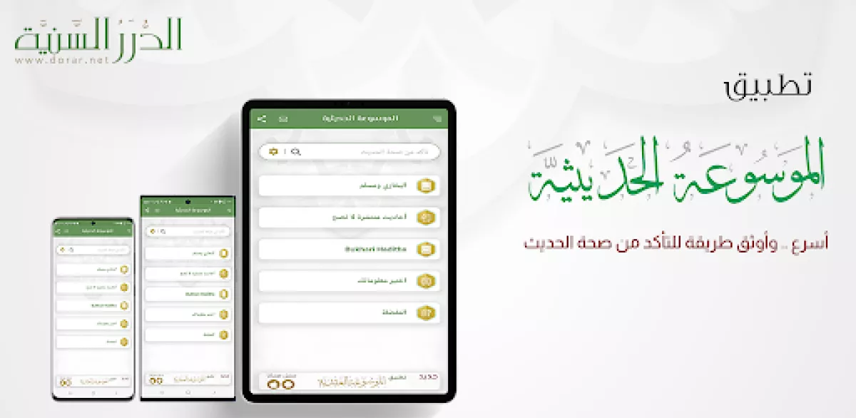 وهذا هو التطبيق الرسمي الوحيد الصادر عن مؤسسة الدرر السنية للموسوعة الحديثية.