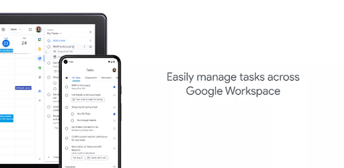 Get more done with the Google Tasks mobile app. Manage, capture, and edit your tasks from anywhere, at anytime, with to-dos that sync across all your devices. Integrations with Gmail and Google Calendar help you get tasks done—faster. Quickly capture tasks anywhere • Create task lists with your most important to-dos • View, edit, and manage tasks on the go, from any device • Manage tasks created in Gmail or Calendar on the web from your mobile device Add details and create subtasks • Break down your tasks to subtasks • Add details about the work you need to focus on • Edit details about any task as your work progresses View tasks created from emails • Create a task directly from an email in Gmail • View your tasks in the side panel of Gmail • Trace a task back to its source email Stay on track with due dates and notifications • Set a due date for every task to help you achieve your goals • Organize your tasks by date or prioritize using drag-and-drop • Receive due date notification reminders to keep your tasks on track Part of G Suite • Bring Google's suite of powerful, intelligent apps to your business • Leverage Google’s AI to bring data insights and analysis to every employee • Connect with your team seamlessly using one suite: Gmail, Tasks, Calendar & more Take control of your task management and install the Google Tasks mobile app. Start easily managing your to-do list on the go with the Tasks planner app from Google.