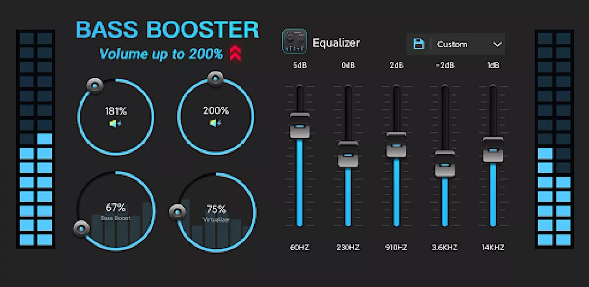 Improve the sound quality of your android device with the Bass Boost, Volume Boost, Virtualizer and Equalizer. Make your music and video sound like never before.