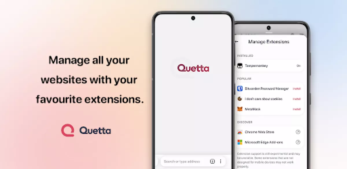 Enhance your browsing experience with extensions. Quetta Browser is a great alternative to Kiwi Browser. You can now personalize your experience in Quetta with extensions such as cookie management, speed control for videos and audios, and manage your passwords.