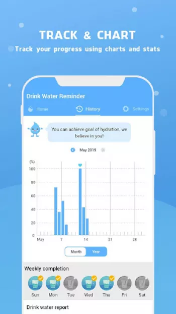 The Drink Water Reminder app is loaded with a multitude of features designed to provide a comprehensive solution to hydration management. Firstly, its user-friendly interface makes it easy for anyone, irrespective of age or tech-savviness, to navigate and use effectively. It is equipped with a water tracker based on the user's gender and weight, allowing for a personalized hydration plan. This means that instead of a one-size-fits-all recommendation, the app provides insights tailored to the user's personal hydration needs. There is also a unique human body graphic that visually represents individual hydrating progress, offering users a clear and engaging way to monitor their water intake. The app comprises a diverse menu that includes nearly 20 different types of drinks, allowing users to account for various sources of hydration. Additionally, customization options allow for the selection of the amount of each drink consumed, which the app then uses to update the user's hydration status. Smart reminders can be scheduled, even excluding non-waking hours, ensuring that users are only reminded when they are likely to be awake. Moreover, detailed charts tracking water consumption over weeks, months, and years are provided, offering a thorough historical view of hydration habits. Lastly, there are achievements that motivate users to meet daily goals, gamifying the process of staying hydrated and encouraging consistent adherence to hydration plans.