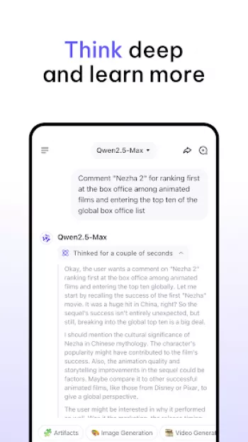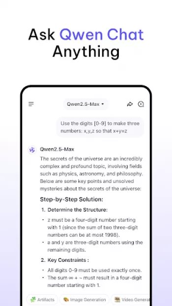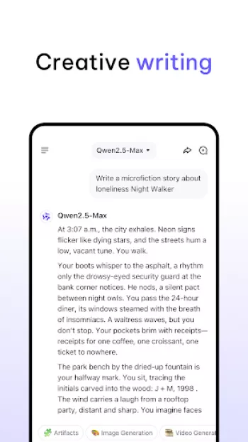 Creativity finds a distinctive ally in Qwen Chat through its inventive writing assistance and image generation capabilities. The application transcends typical AI functionalities by inspiring and propelling users into realms of limitless creativity. Whether penning a novel, drafting an academic paper, or conceptualizing complex essays, Qwen Chat provides a catalyst for ideas, helping users break free from conventional thought barriers. It encourages the exploration of uncharted territories by suggesting novel approaches to thematic development, character arcs, or argumentative structures. Beyond textual creativity, Qwen Chat's image generation feature allows users to transform their creative visions into reality with visually stunning results. Users can describe the imagery they wish to create, and Qwen Chat generates high-quality images that bring those descriptions to life—from realistic portraits to abstract artworks. In practical applications, this facilitates artists, designers, and content creators in developing new concepts, enhancing their portfolios, or executing innovative projects. This integration of text and visual creativity enhances productivity and allows users to explore synergies between written and pictorial expressions. As a tool that nurtures innovation, encourages imaginative exploration, and supports content creation across multiple dimensions, Qwen Chat positions itself as an invaluable resource for individuals and professionals alike who seek to elevate their creative endeavors to new heights. With options available for various platforms like Android, users are invited to Download for Android to experience this new world of creative possibilities.