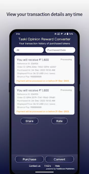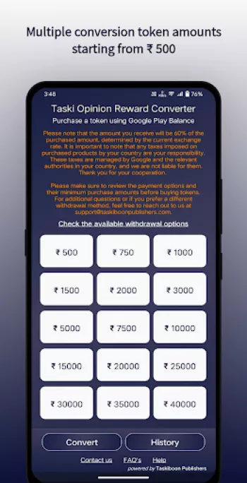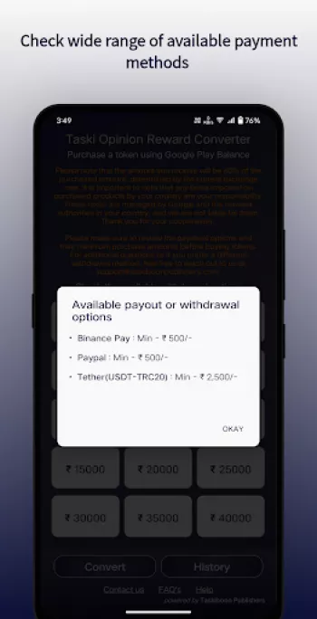 At its core, the Rewards and Opinion Converter App functions through a meticulously designed system that transforms Google Play balances and user opinions into cash. The process begins when a user decides to purchase tokens within the app. These tokens act as the primary digital currency, allowing users to transact within the platform effortlessly. The app converts Google Play Balance, Google Play Credit, or even Play Store Gift Cards into tokens, initiating the conversion process. This transaction model not only provides a seamless user experience but also ensures that the app can operate efficiently within the regulatory frameworks governing digital transactions. Once the tokens are purchased, the user gains the flexibility to choose from various payment methods based on what best suits their needs. Options include popular financial services such as PayPal, known for its international accessibility, and Binance, which caters to those who prefer cryptocurrency transactions. This multi-platform approach means that the app can cater to a diverse range of user preferences and needs, enhancing its appeal across demographic lines. The platform ensures the security and privacy of transactions by using encrypted pathways, safeguarding user data against potential breaches. Moreover, the system is designed to handle large volumes of transactions concurrently, ensuring users receive their payments within the stipulated timeframe of five to seven days. The platform’s transparency is further ensured through clear communication of the fees involved; users are duly informed that Google charges a 30% platform fee, while the app charges an additional 10% processing fee, leaving users with a transparent net gain conversion rate of 60%. This structured, clear fee system fosters trust and encourages repeat engagements. It's a model not just based on functionality but on reliability and user satisfaction, creating a robust framework for sustainable operation in the competitive app marketplace.